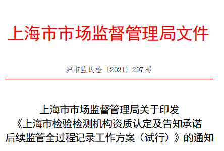 5月24日,上海市市場監管局發布《上海市檢驗檢測機構資質認定及告知承諾后續監管全過程記錄工作方案(試行)》。《工作方案(試行)》提出,上海市檢驗檢測機構資質認定所有審批事項(包括首次、復查、擴項、變更)及告知承諾后續監管實施全過程記錄。其中,對上海市檢驗檢測機構資質認定現場評審及告知承諾后續監管現場檢查實施全程音像記錄。